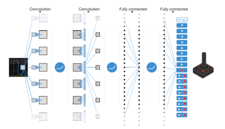 神经网络的输入包括由预处理映射生成的84*84*4图像,然后是三个卷积层(注:蛇形蓝线表示每个滤波器在输入图像上的滑动)和两个全连接层,每个有效动作都有一个输出。每个隐层之后都有一个整流非线性层(即 max(0,x))。