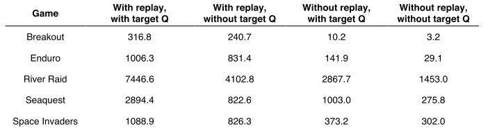 消融实验:DQN 智能体的各个核心组件—经验回放、独立目标Q网络和深度卷积网络架构--的重要性,禁用它们并证明了对性能的不利影响
