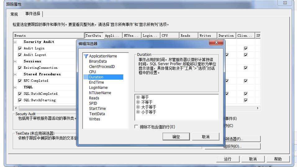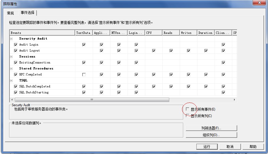 上图中左面的可以进行一个基本设置,使用的模板选择,和文件的保存选择等。我们一般使用默认的就OK了,不用动上面的东西,右面的图是事件选择,也就是说我们要跟踪的事件有那个,在这里可以一一的选择,基本上Sql上有的事件都有,包括你用SQL Server Management Studio操作数据库的过程都可以跟踪的到。具体的事件和说明大家可以自己看一下。 只要单击显示所有事件就可以进行全部事件的选择了。 我们还可以对统计的字段进行筛选,单击任意一个列标题可以查看列的说明如下图