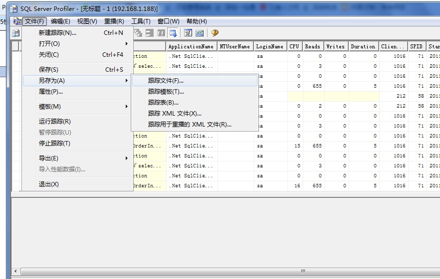 有了这个跟踪的记录我们怎么样使用数据库引擎优化顾问对其进行分析优化呢?当然第一步我们要先把跟踪到的记录导出到文件.trc类型的文件。单击文件--另存为