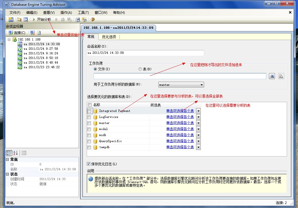 我们可以看一下界面,一般不用选择只要安默认的就OK了,需要配置的我上面都有注释。在这里大家一定要记得选择用于工作负荷的数据库和表,意思就是设置要分析的数据库否则会分析不成功。 现在就可以单击开始了