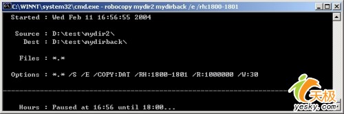 /mot后接的是时间(分钟),是指Robocopy执行操作的最短时间;/mon后接的是最少文件修改个数。在监视过程中,会自动记录时间和修改的次数,只有同时符合以上两个条件时,Robocopy才开始执行,执行完成后,这两个数据会自动清零,并重新开始监视文件夹,除非用户关闭命令提示符窗口或按下Ctrl+Break键。 [举一反三] 如果你要开机就监视并备份相应文件夹,则可以把上述命令放到“启动”组中。 实例十三:不到时间不备份 [实现效果]复制的过程总会占用系统资源,如果能设置在自己不在电脑边上的时候开始复制备份,就会方便得多。比如,每天5:50下班,希望下班后,到达6点时,Robocopy自动开始备份相应数据。 [简单命令] robocopy d:/work e:/back /e /rh:1800-1830 [举一反三] 运行后,复制操作将会等待至指定时间开始(如图3)。其中,RH格式为/RH:hhmm-hhmm,指定Robocopy开始的时间段,在这个时间段外,拷贝会被暂停。时间为24小时格式,4个数字长,从0000到2359,而且两个数字不能相同。