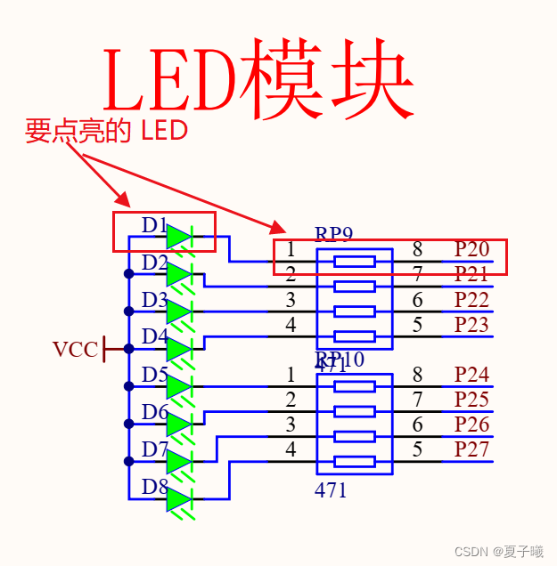 二进制是0000 0000 。如果只点亮D1一个,只需要将D1位置的bit位设置为0
