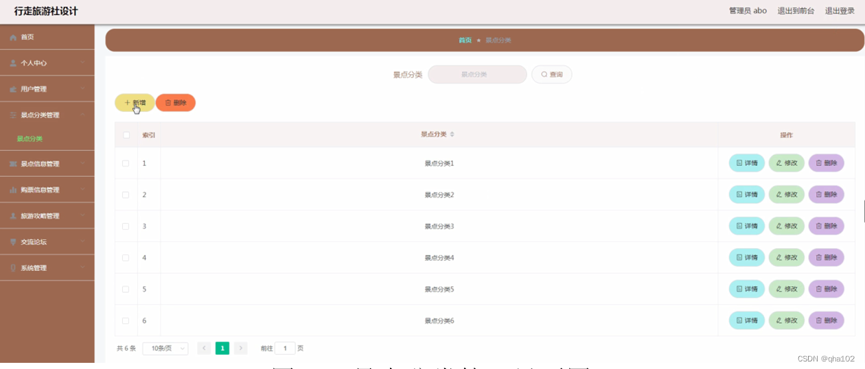 景点分类管理,在景点分类管理页面可以对索引、景点分类等信息进行详情、修改或删除等操作,如图4-9所示。