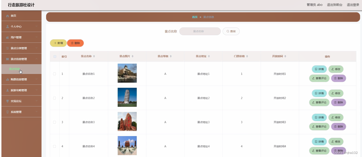 景点信息管理,在景点信息管理页面可以对索引、景点名称、景点图片、景点等级、景点地址、门票价格、开放时间等信息进行详情、修改、查看评论或删除等操作,如图4-10所示。