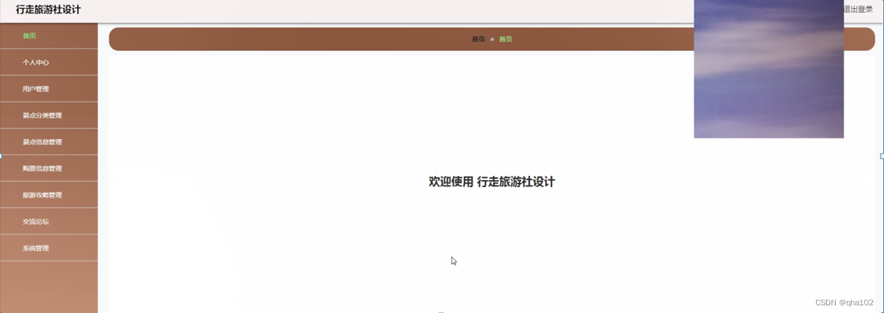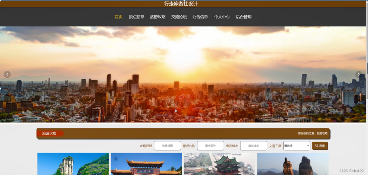 行走旅游社设计,在网站首页可以查看首页、景点信息、旅游攻略、交流论坛、公告信息、个人中心、后台管理等内容进行详细操作,如图4-1所示。