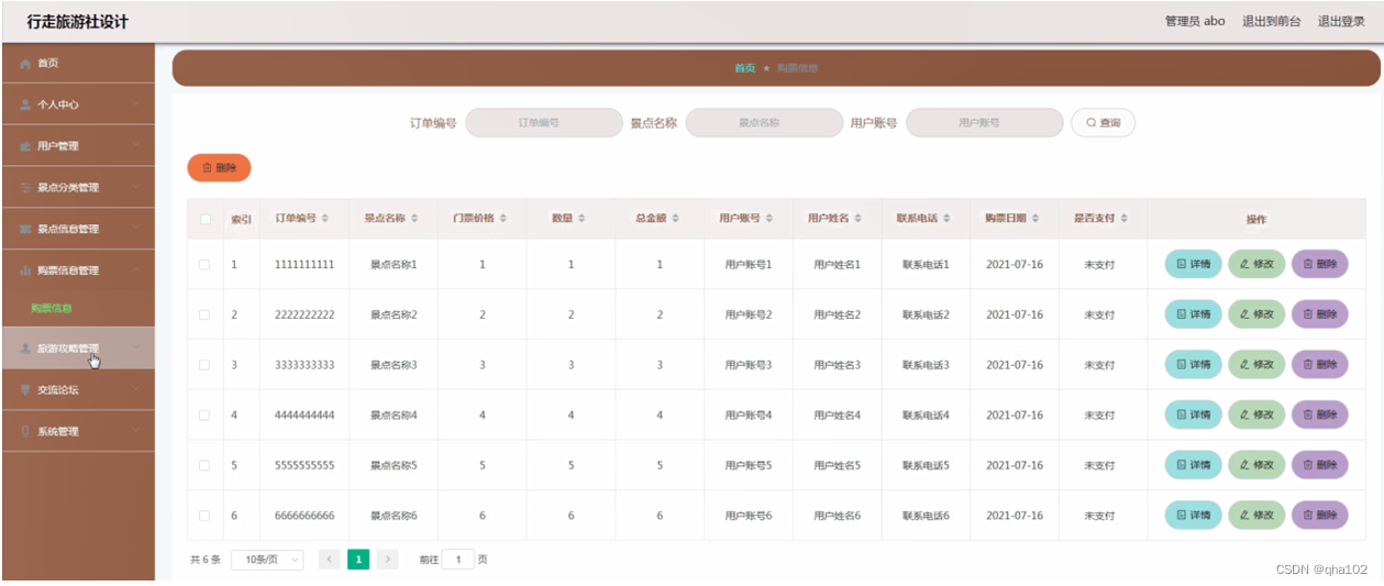 购票信息管理,在购票信息管理页面可以对索引、订单编号、景点名称、门票价格、数量、总金额、用户账号、用户姓名、联系电话、购票日期、是否支付等信息进行详情,修改或删除等操作,如图4-11所示。