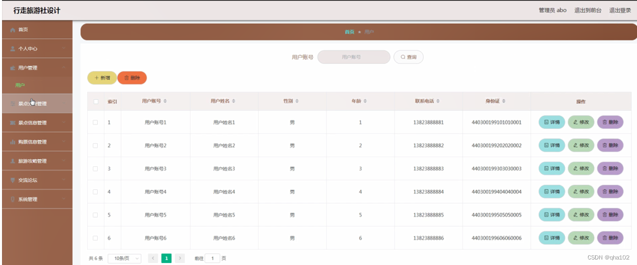 用户管理,在用户管理页面可以对索引、用户账号、用户姓名、性别、年龄、联系电话、身份证等信息进行详情,修改或删除等操作,如图4-8所示。