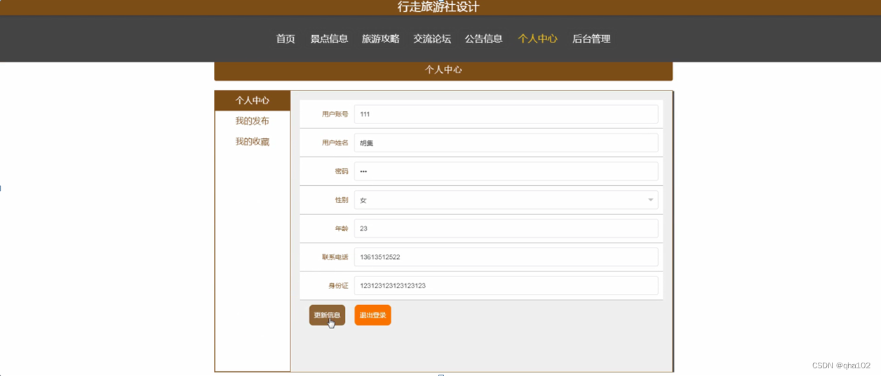 个人中心,在个人中心页面通过填写用户账号、用户姓名、密码、性别、年龄、联系电话、身份证等内容进行信息更新操作,还可以根据需要对我的发布,我的收藏进行相应操作;如图4-5所示。