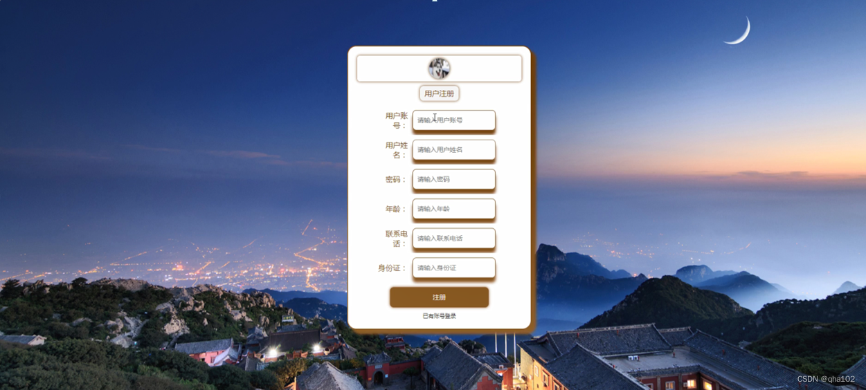 用户注册,在用户注册页面通过填写用户账号、用户姓名、密码、年龄、联系电话、身份证等信息进行注册操作,如图4-4所示。