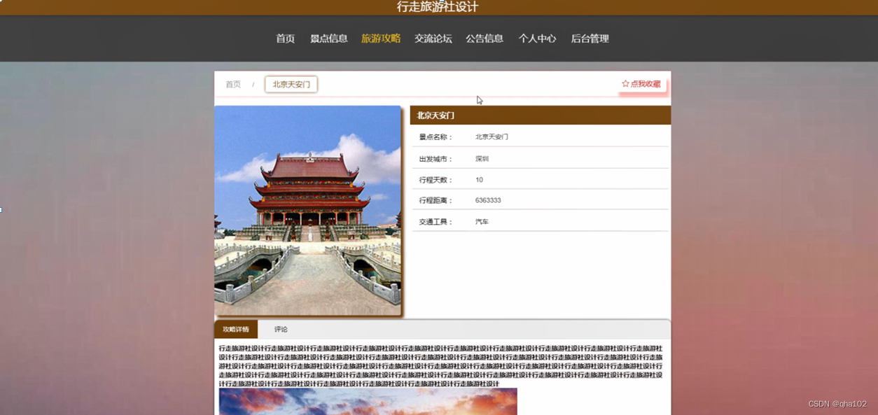 旅游攻略,在旅游攻略页面可以查看攻略标题、景点名称、出发城市、行程天数、行程距离、交通工具、景点封面等信息,用户登录后即可进行攻略详情、评论或收藏等操作,如图4-3所示。