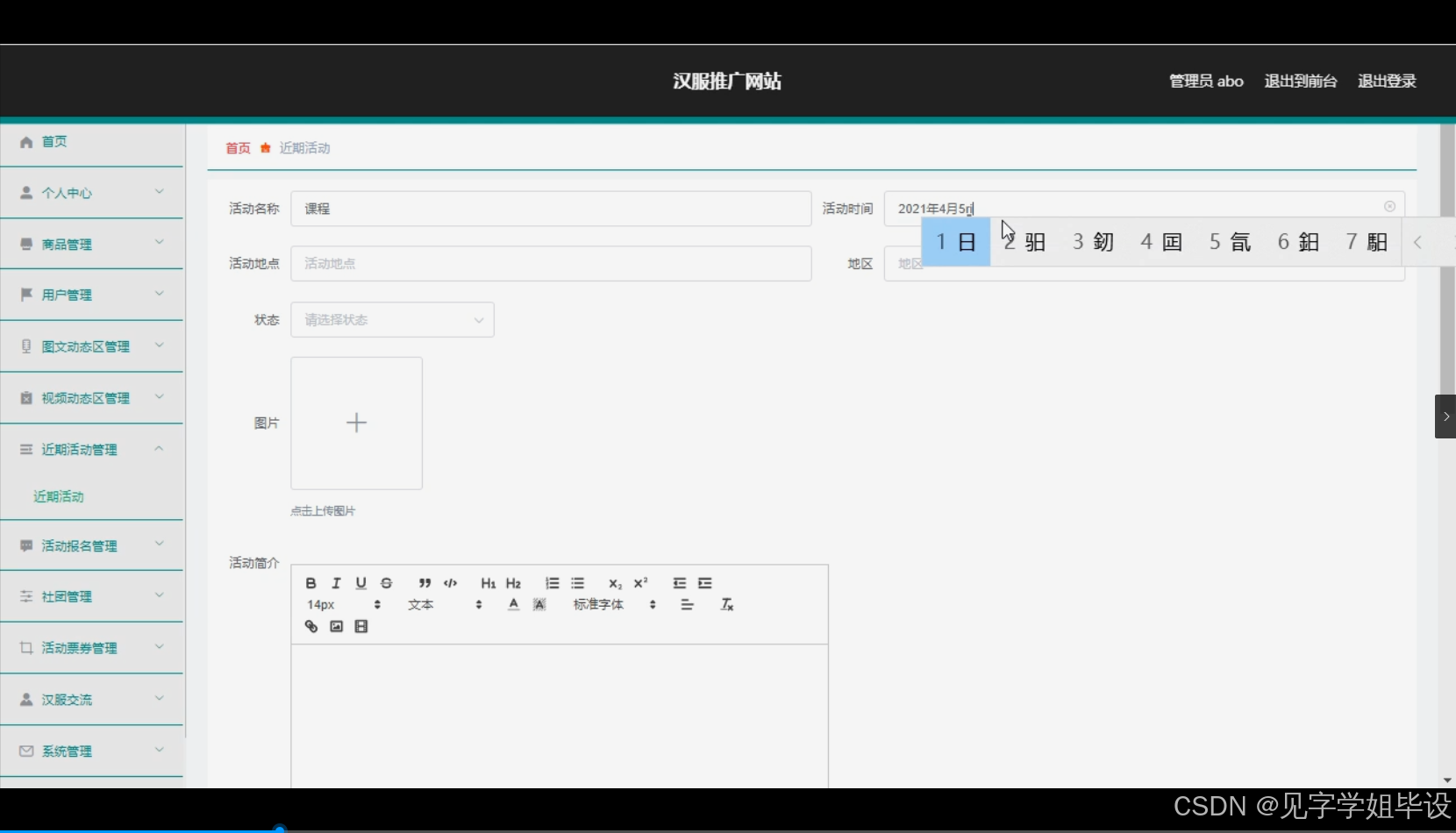 规划近期活动的类型,如汉服展览、汉服设计比赛等。研究活动报名的流程设计,如何确保报名信息的准确性和活动的参与度。分析如何通过网站对活动进行宣传推广,提高活动的知名度和影响力。