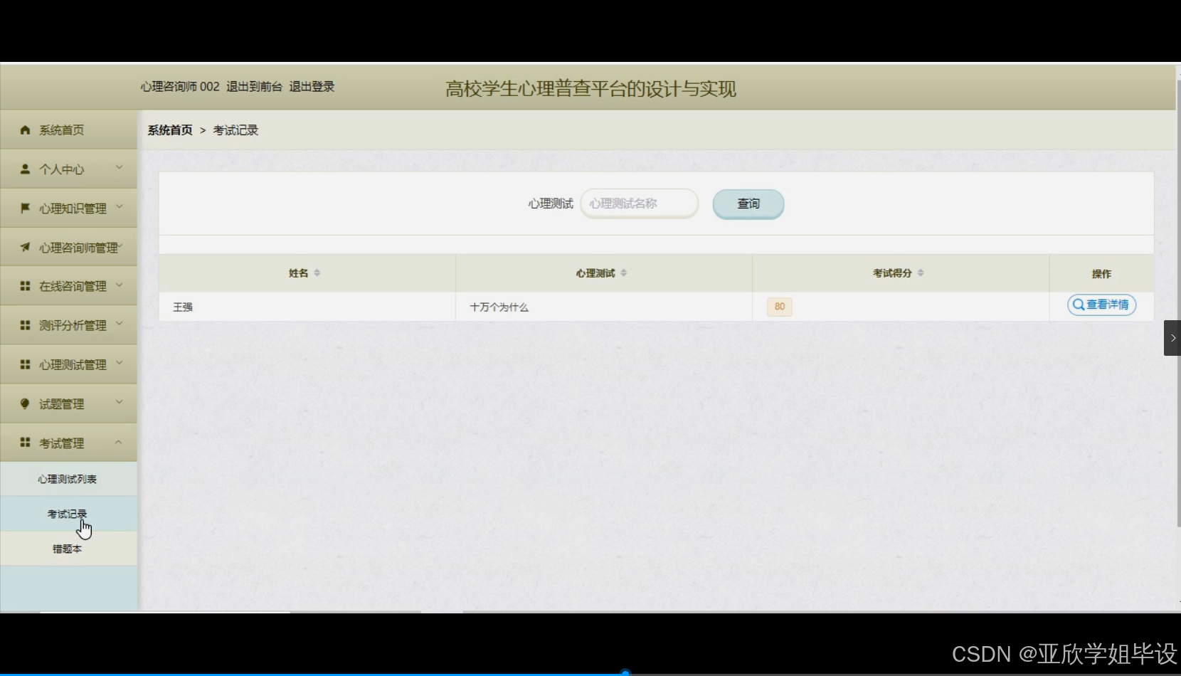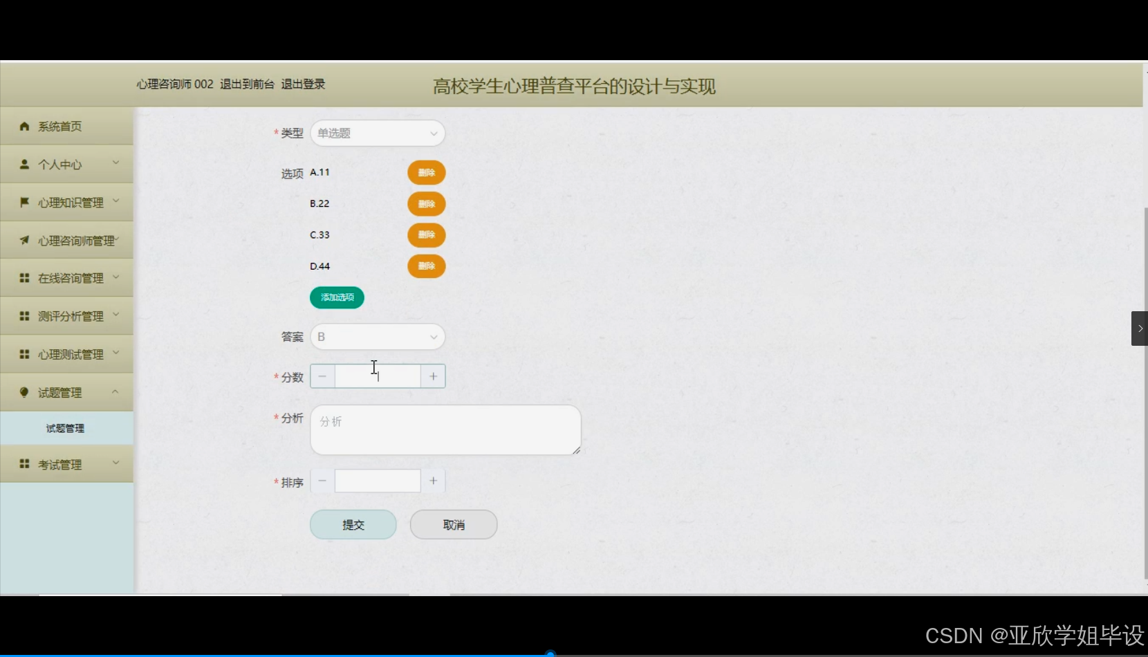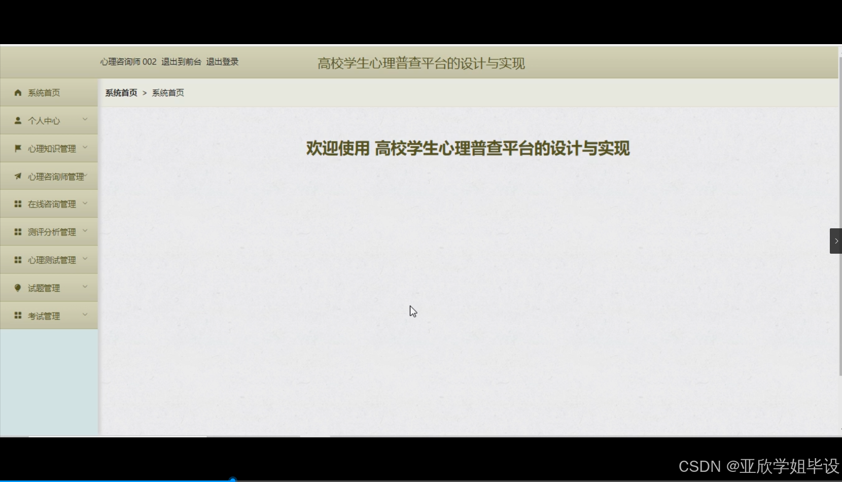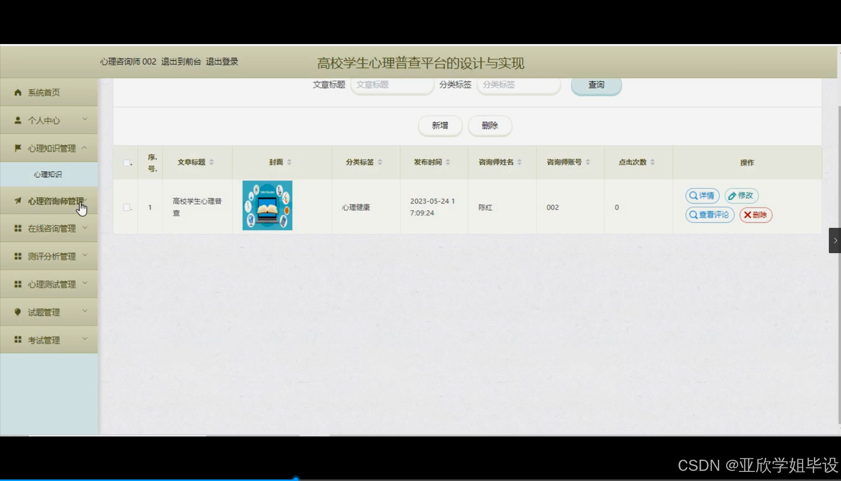 - 心理咨询师模块:包括咨询师注册管理、学生测评结果查看与分析等功能。咨询师可以通过平台及时获取学生的心理状况,为后续的咨询服务提供依据。
