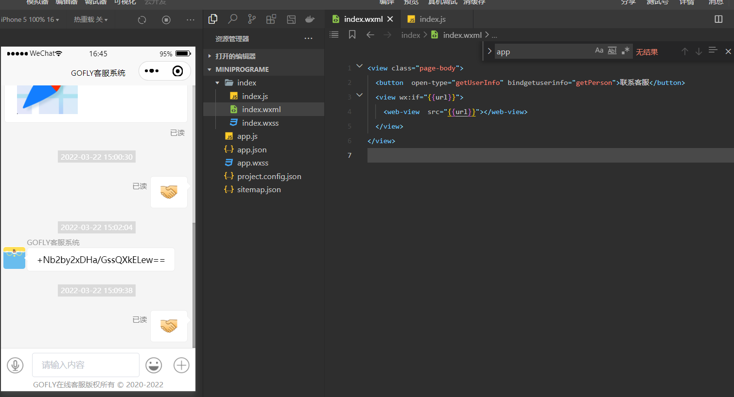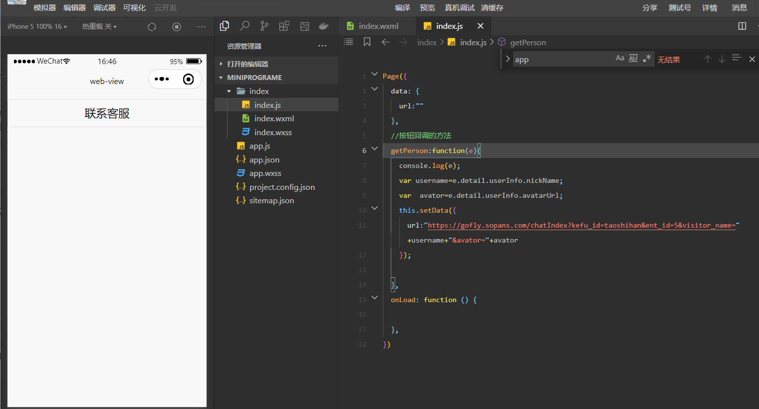 js部分。这里面就是拼接我的客服系统聊天界面链接,重要的是visitor_id参数部分,按照我的要求是 mini|商户ID|openid ,这样我在客服系统那里,好拿到openid去发送订阅消息