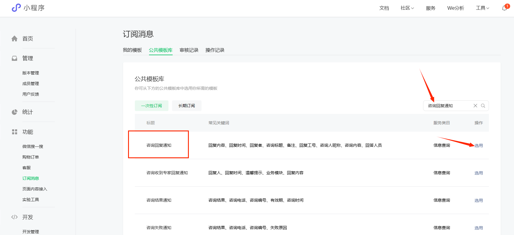 我们前往小程序后台,去开启一下订阅消息,并且选用一个模板。