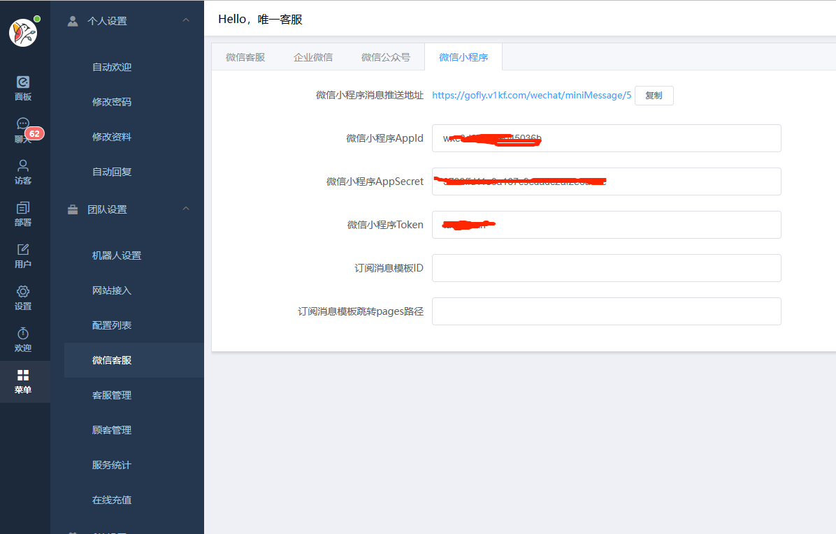 上面就是小程序后台部分的配置,接下来返回我的客服系统后台,去配置相应的信息