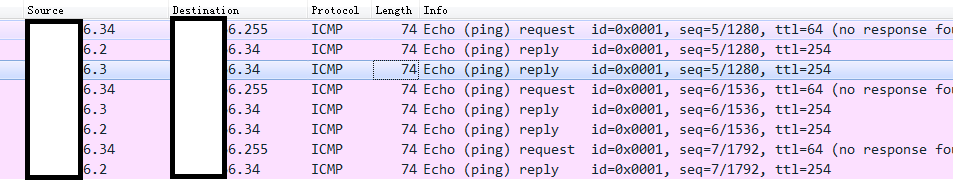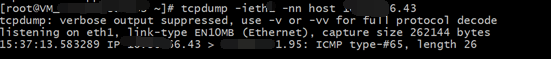 发现256个包仅有proto值为1的包(即ICMP)通过网络到达目标服务器,因为我们填充的A覆盖了ICMP的type,所以tcpdump识别type是65——说明任意类型甚至是不合法的ICMP包都可以在这两个主机间通信。