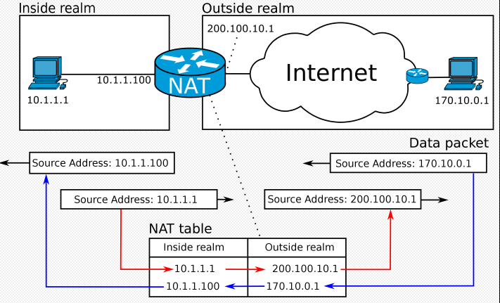 我们先看下NAT的工作原理[7],NAT会作为内外网的网关节点,类似中间人,把内外网IP地址互相转换,即外网看到的是外网地址,内网看到的是内网地址,使得双方能够正常通信。