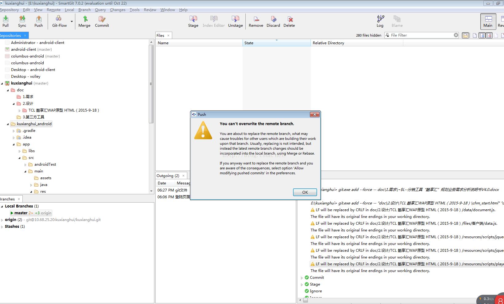 remote是远程的意思,branch是分支的意思,you can't overwrite the remote branch英文的意思是我的remote branch被移动位置了,应该选中edit下面的prefrences下面的allow modify pushed commits问题就完美解决了。