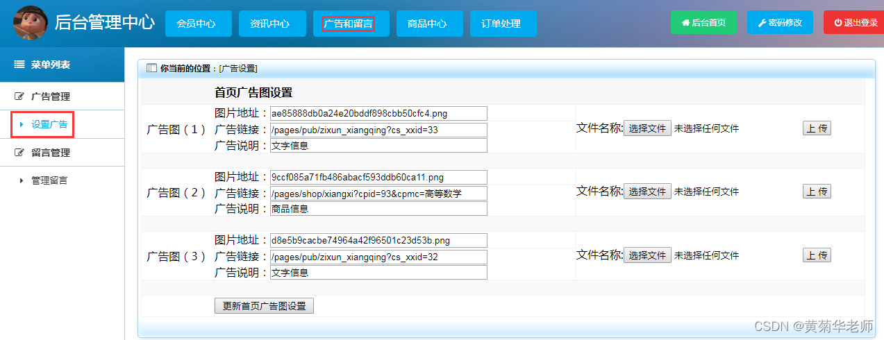 广告设置:上传图片和设置小程序首页轮播图广告地址