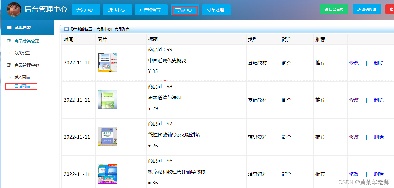 图书管理:查看所有已经录入的图书信息、支持修改和删除