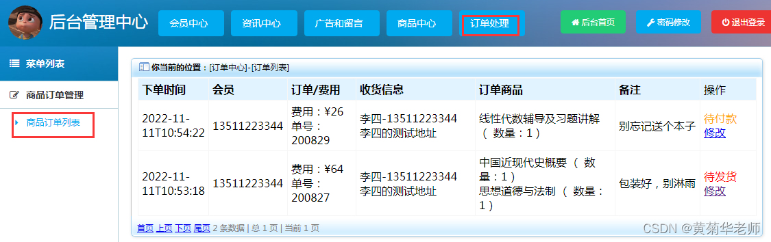 图书订单:查看所有用户下单的订单信息,包括下单时间、费用、收货地址、收货人信息、订单图书信息和备注等