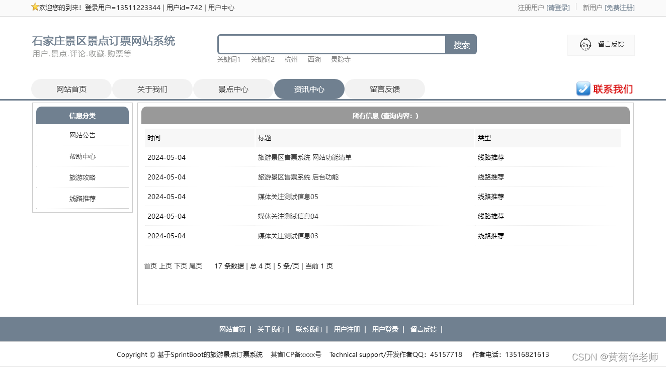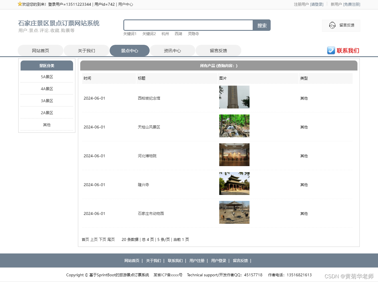 景点中心:显示网站提供的所有景点信息;可以按景区的等级分类。