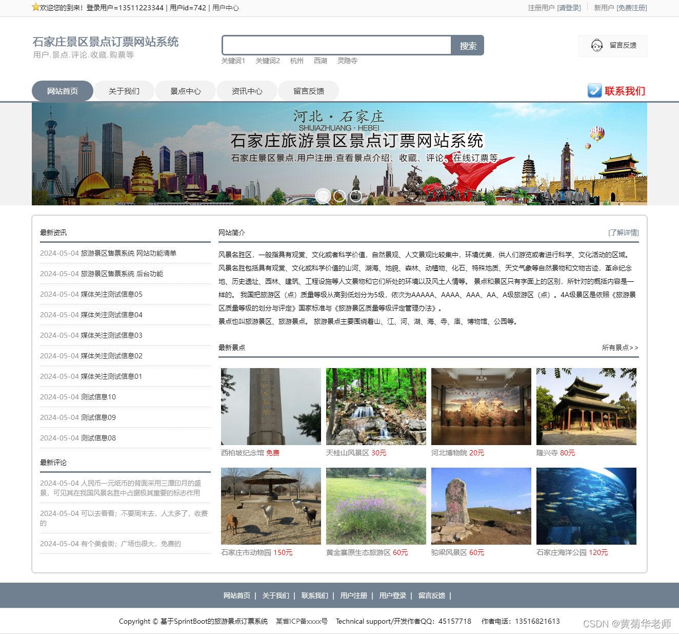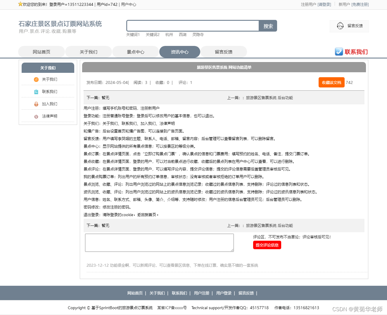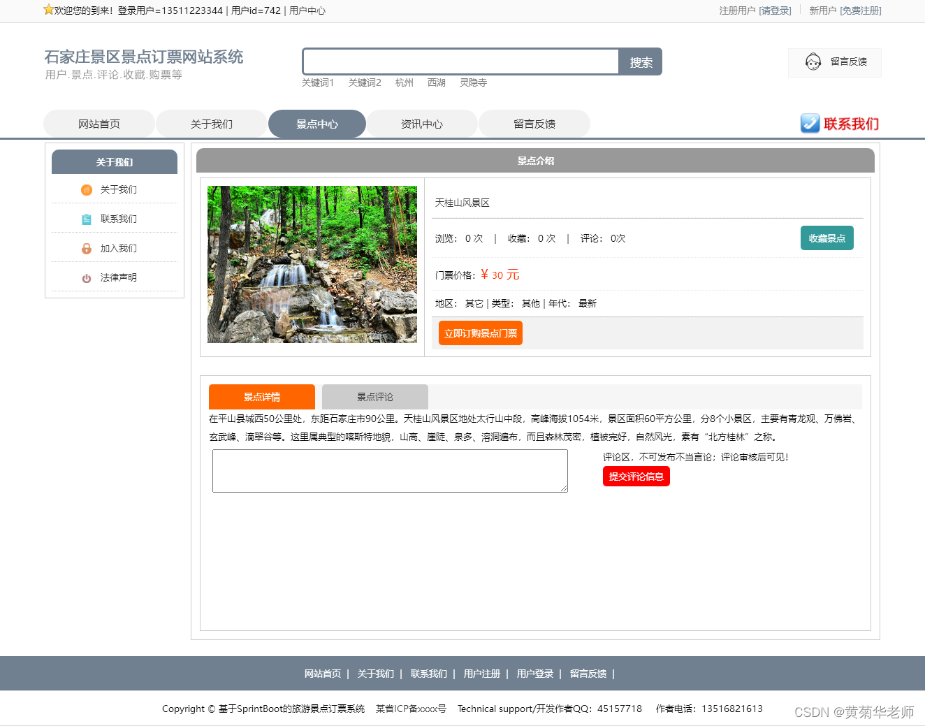 景点评论:在景点详情页面,登录的用户,可以填写评论内容,提交评论信息;提交的评论信息需要后盖管理员审核后可见。