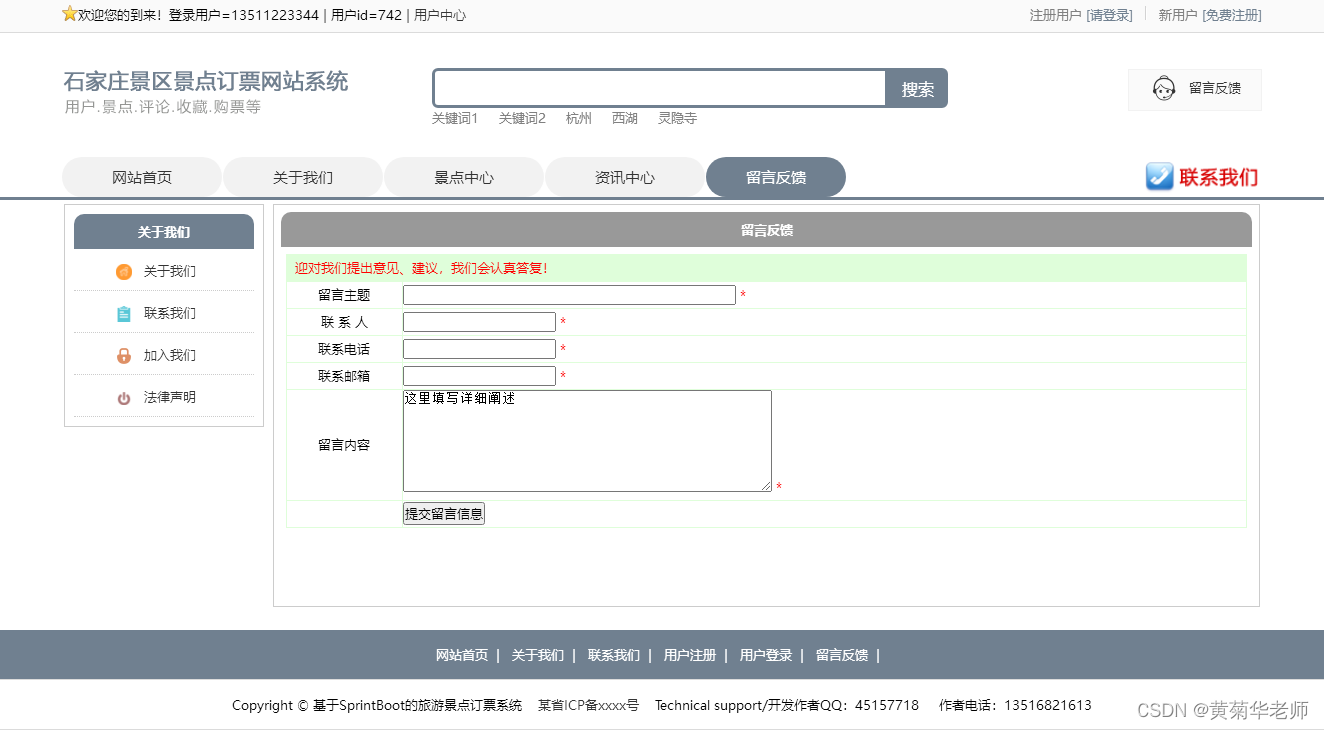 留言反馈:用户填写李哭咽的主题、联系人、电话、邮箱、留言内容;后台管理可以查看留言列表,可以删除留言。
