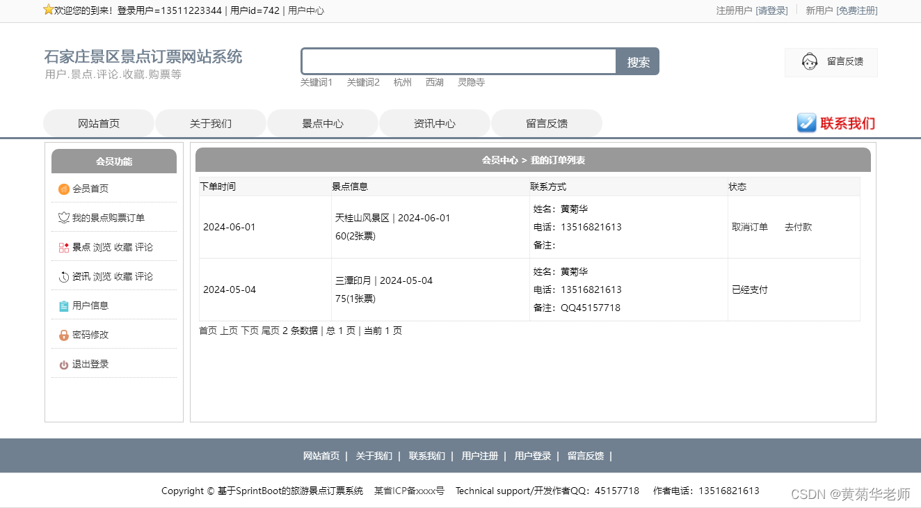 我的景点购票订单:列出用户的所有预约订单信息,审核状态;没有审核或者审核拒绝的订单用户可以删除。