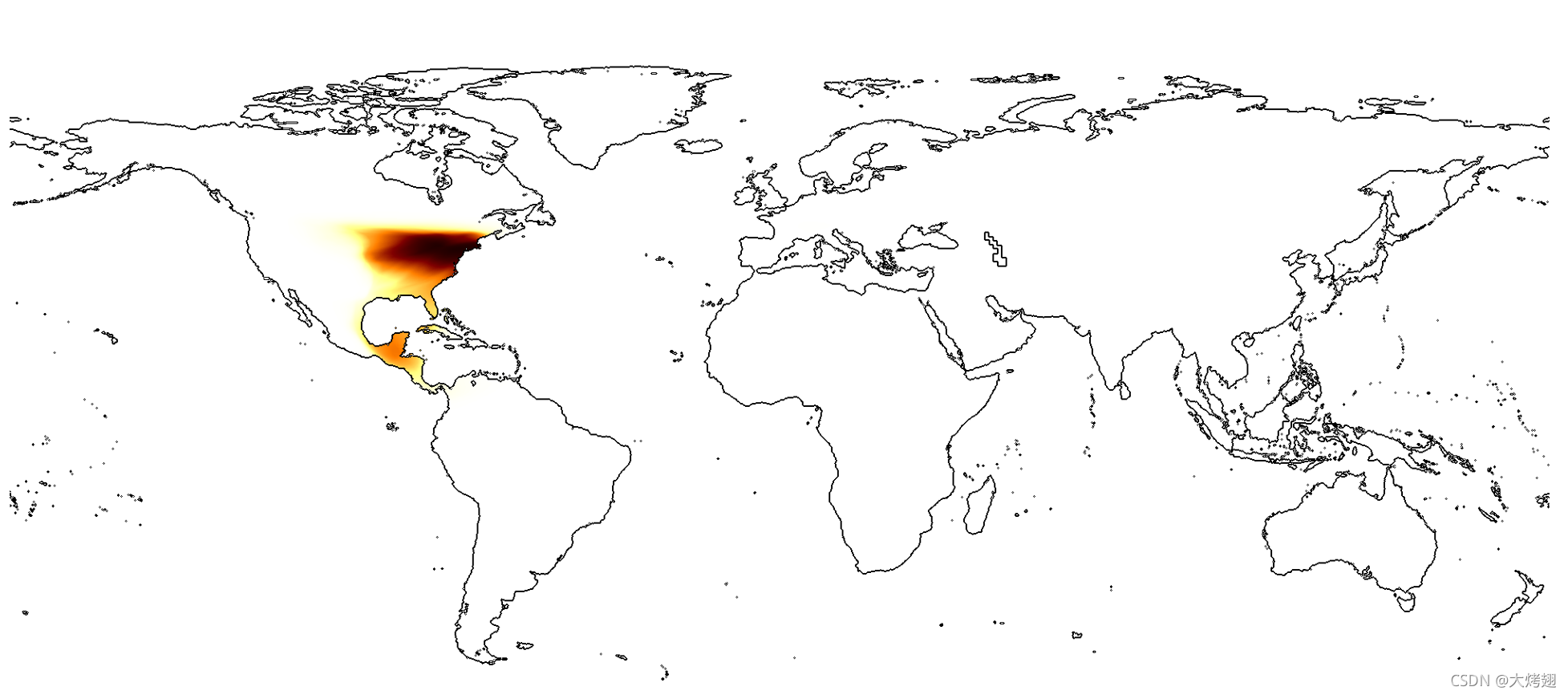 类别ID为3731的物种是Hylocichla mustelina - Wood Thrush,生成了一张图片hylocichla_mustelina.png,保存在项目根目录中,用来表示预测的分布,如下图。