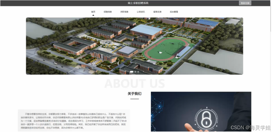 当人们打开系统的网址后,首先看到的就是系统首页界面。在这里,人们能够看到网上求职招聘系统的导航条包含首首页、招聘信息、求职信息、公告资讯、留言反馈、后台管理等,界面如图5-1所示: