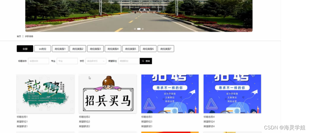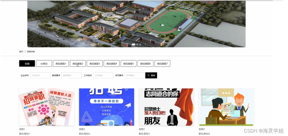 用户点击招聘信息,进入招聘信息界面,用户可输入企业名称、薪资要求、工作地点、学历要求进行查询的操作,并可点击岗位类型指引进去查看详细的招聘信息,直接点击应聘,在线提交简历等操作,界面如图5-5所示: