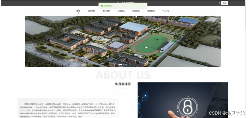用户登录后,用户能够看到网上求职招聘系统的导航条包含首页、招聘信息、求职信息、公告资讯、留言反馈、后台管理、个人中心等,界面如图5-3所示: