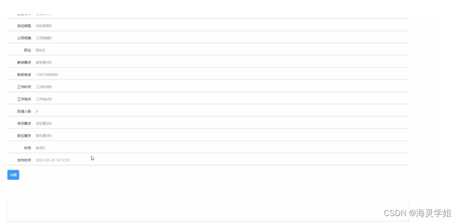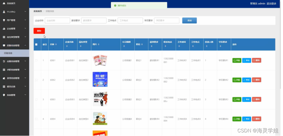 管理员点击招聘信息管理,进入招聘信息管理页面,管理员可通过企业名称、薪资要求、工作地点、学历要求进行查询、删除的操作,并可对招聘信息进行查看详情、修改、删除等操作;如图5-15所示: