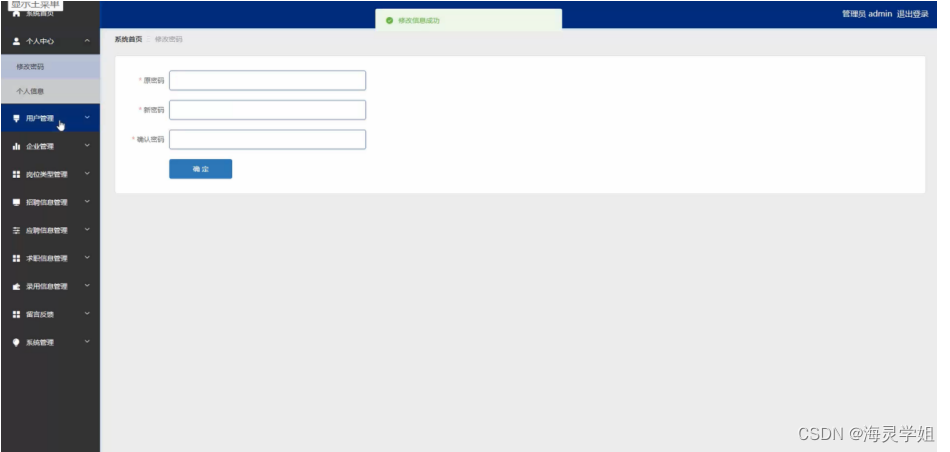 管理员点击个人中心,进入个人中心界面,管理员可查看并修改个人信息及修改密码等操作;如图5-11所示: