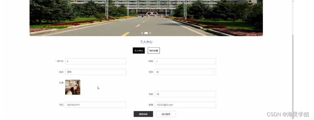 用户点击个人中心,进入个人中心界面,用户可查看更新个人信息、查看我的收藏等操作,界面如图5-4所示: