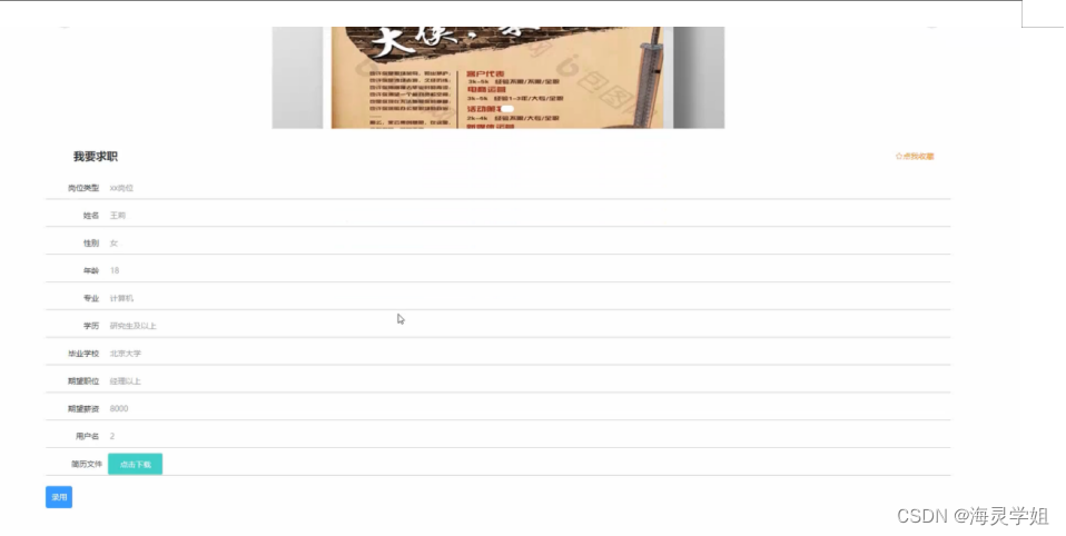 用户点击求职信息,进入求职信息界面,用户可输入标题名称、专业、学历、期望职位进行查询的操作,并可点击岗位类型指引进去查看详细的求职信息,可进行下载简历文件、收藏、录用等操作,界面如图5-6所示: