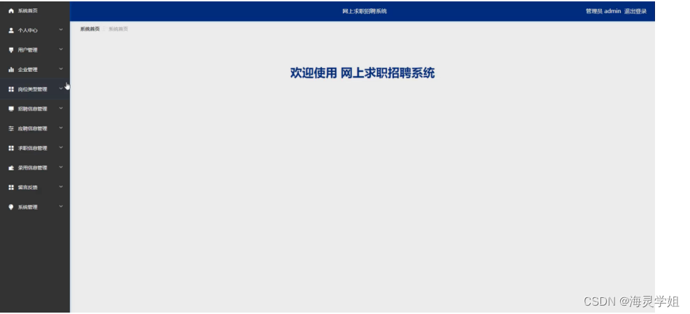 管理员进入主页面,主要功能包括对首页、个人中心、用户管理、企业管理、岗位类型管理、招聘信息管理、应聘信息管理、求职信息管理、录用信息管理、留言反馈、系统管理等进行操作,管理员主页面如图5-10所示:
