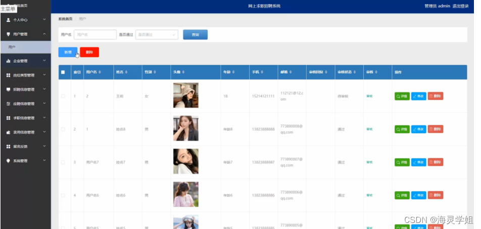 管理员点用户管理,进入用户管理页面,管理员可通过输入用户名、是否通过进行查询、删除、新增等操作,并可对用户信息进行查看详情、修改、删除操作;如图5-12所示:
