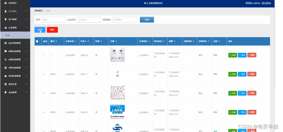 管理员点击企业管理,进入企业管理页面,管理员可通过输入账号、企业名称、是否通过进行查询、删除、新增等操作,并可对企业信息进行查看详情、修改、删除等操作;如图5-13所示: