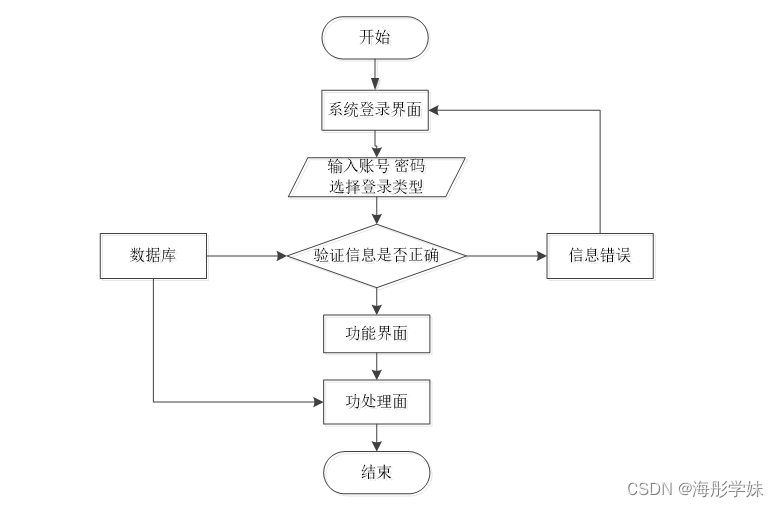 用户想进入系统,首先进入系统登录界面,通过正确的用户名、密码,选择登录类型登录,系统会检查登录信息,信息正确,然后输入相应的功能界面,提示信息错误,登录失败。系统操作流程如图3-4所示。