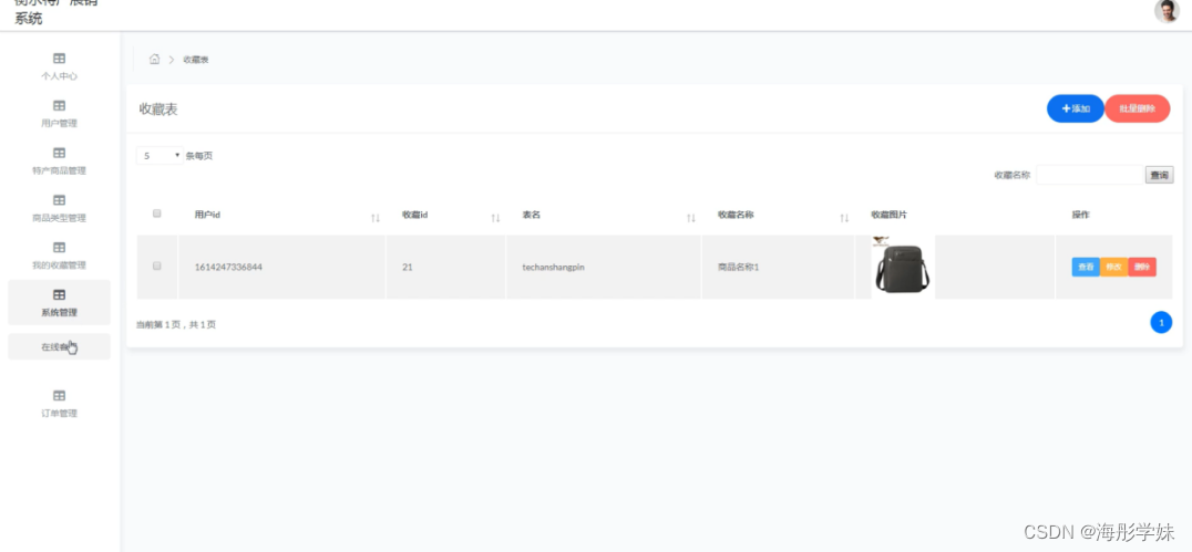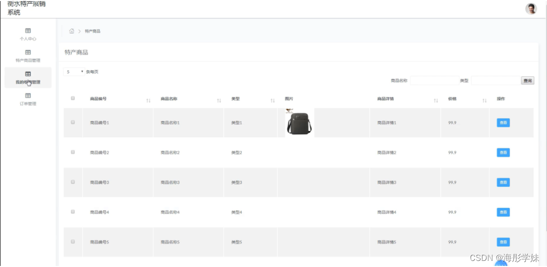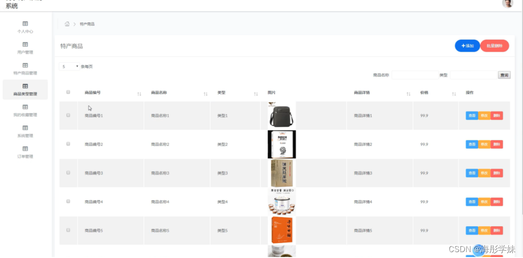 特产商品管理,在特产商品管理页面中可以对商品编号、商品名称、类型、图片、商品详情、价格等信息进行查看等操作,如图5-12所示。