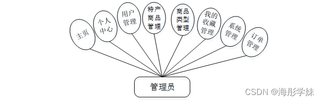 管理员登录后可进行主页、个人中心、用户管理、特产商品管理、商品类型管理、我的收藏管理、系统管理、订单管理,管理员用例如图3-1所示。