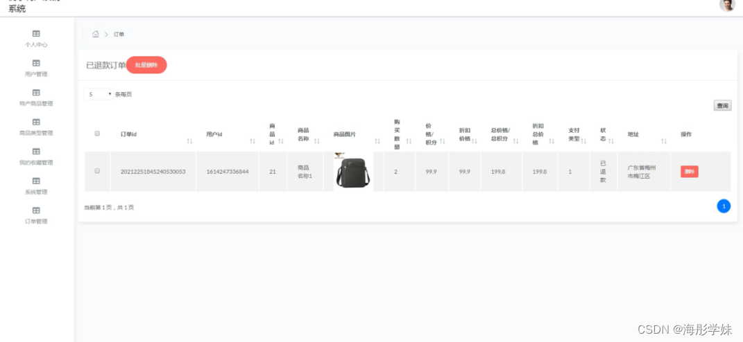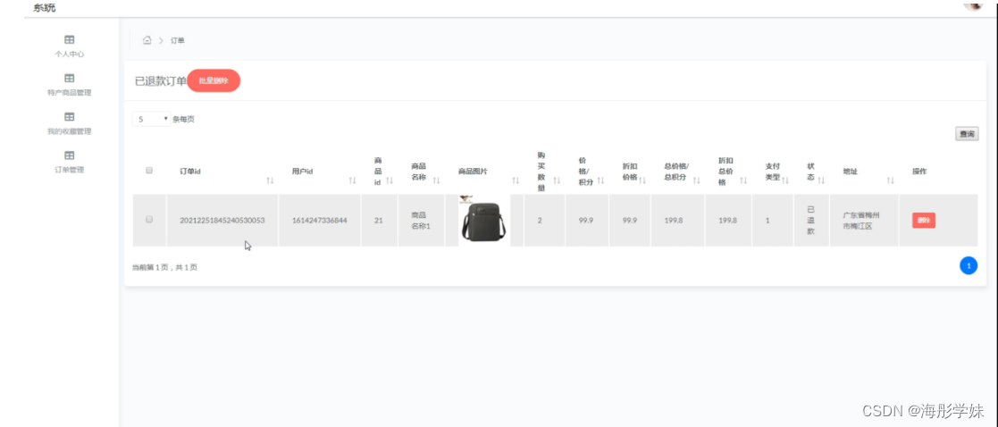 订单管理,在已退款订单页面中可以对订单id、用户id、商品id、商品名称、商品图片、购买数量、价格/积分、折扣价格、总价格/总积分、折扣总价格、支付类型、状态、地址等信息进行删除等操作,并根据需要对未支付订单、已支付订单、已发货订单、已完成订单、已取消订单进行相应操作,如图5-10所示。