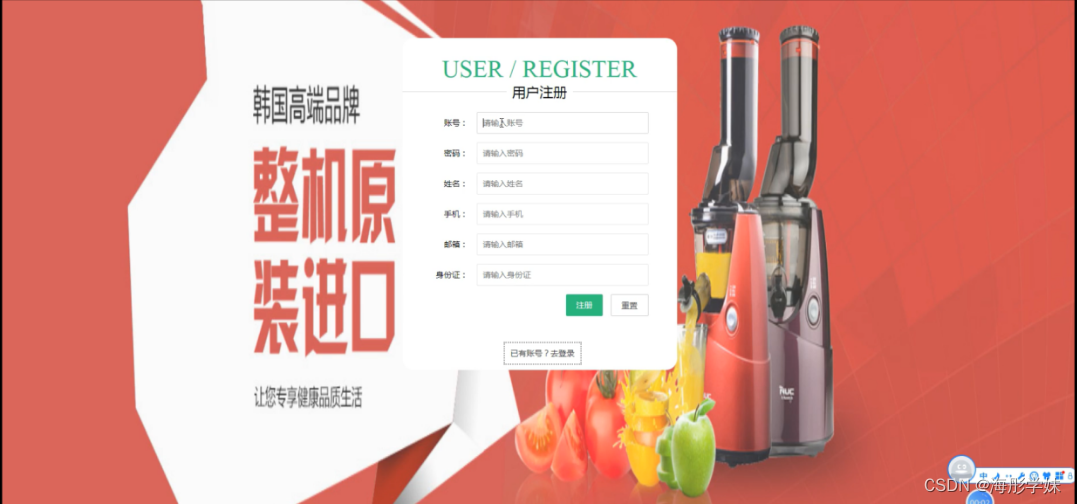 用户注册,在用户注册页面通过填写账号、密码、姓名、手机、邮箱、身份证等信息完成用户注册,如图5-2所示。