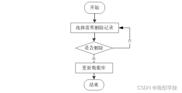 用户选择要删除的信息并单击Delete按钮。系统提示是否删除信息。如果用户想要删除信息,系统将删除信息。系统数据库删除信息。删除信息流程图如图3-5所示。