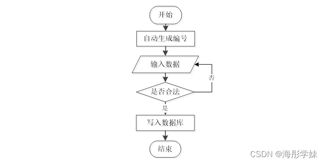 添加信息,编号系统使用自动编号模式,没有用户填写,用户添加信息输入信息,系统将自动确认的信息和数据,验证的成功是有效的信息添加到数据库,信息无效,重新输入信息。添加信息流程如图3-3所示。