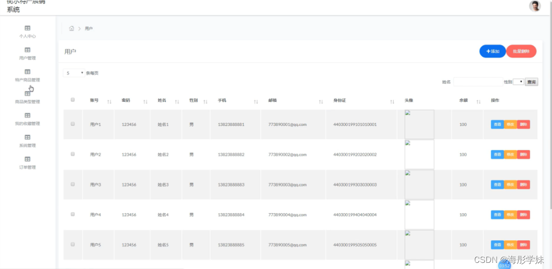 用户管理,在用户管理页面中可以对账号、密码、姓名、性别、手机、邮箱、身份证、头像、余额等信息进行查看,修改或删除等操作,如图5-7所示。