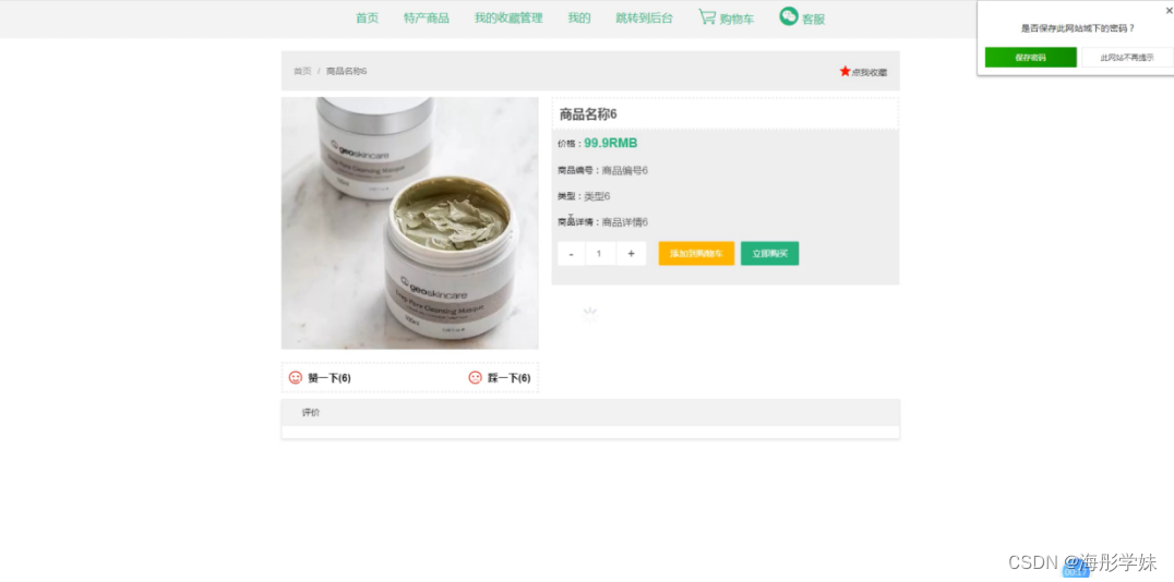特产商品,在特产商品页面中可以查看商品名称、价格、商品图片、商品编号、类型、商品详情等信息,根据需要进行添加到购物车、立即购买、点赞或收藏等操作;如图5-3所示。